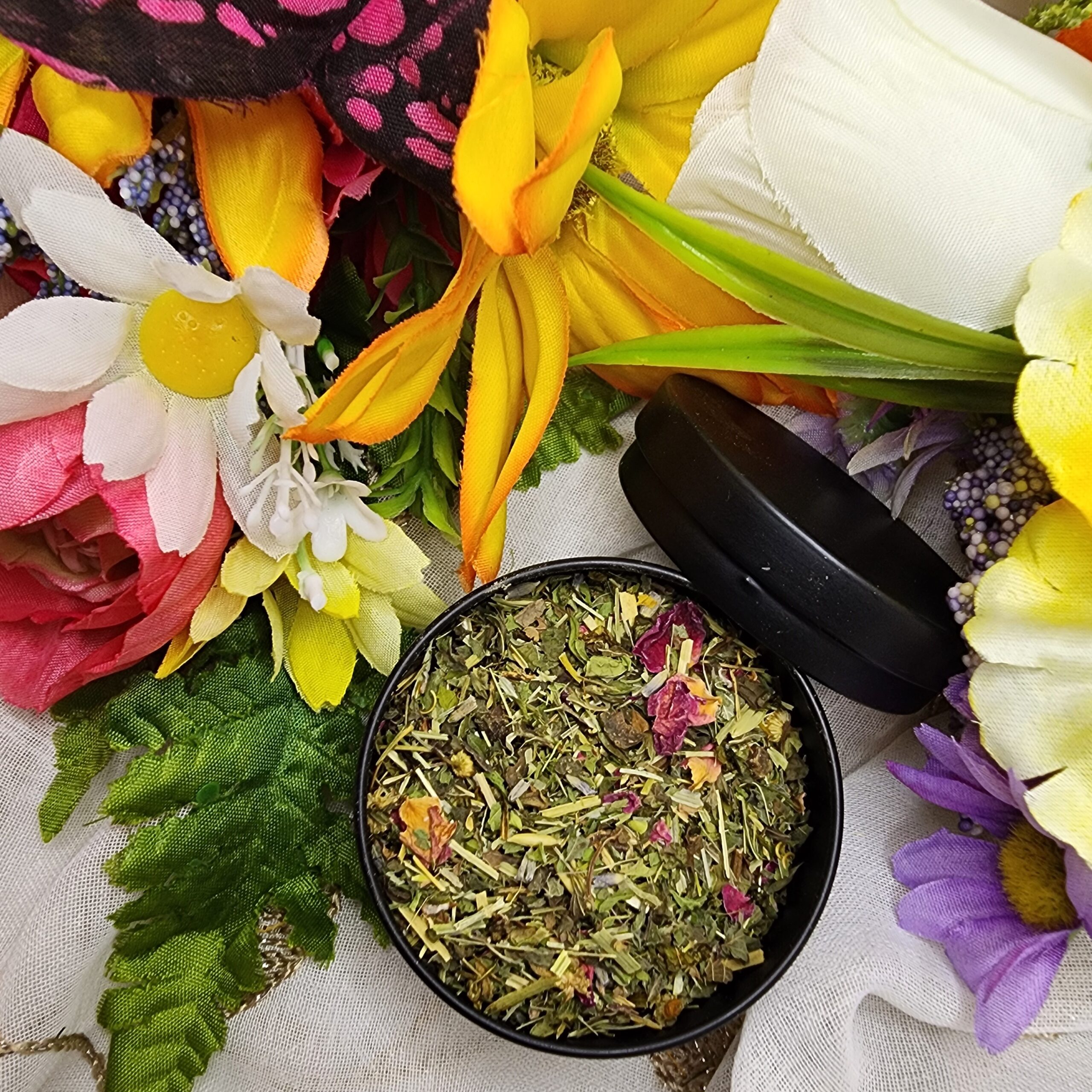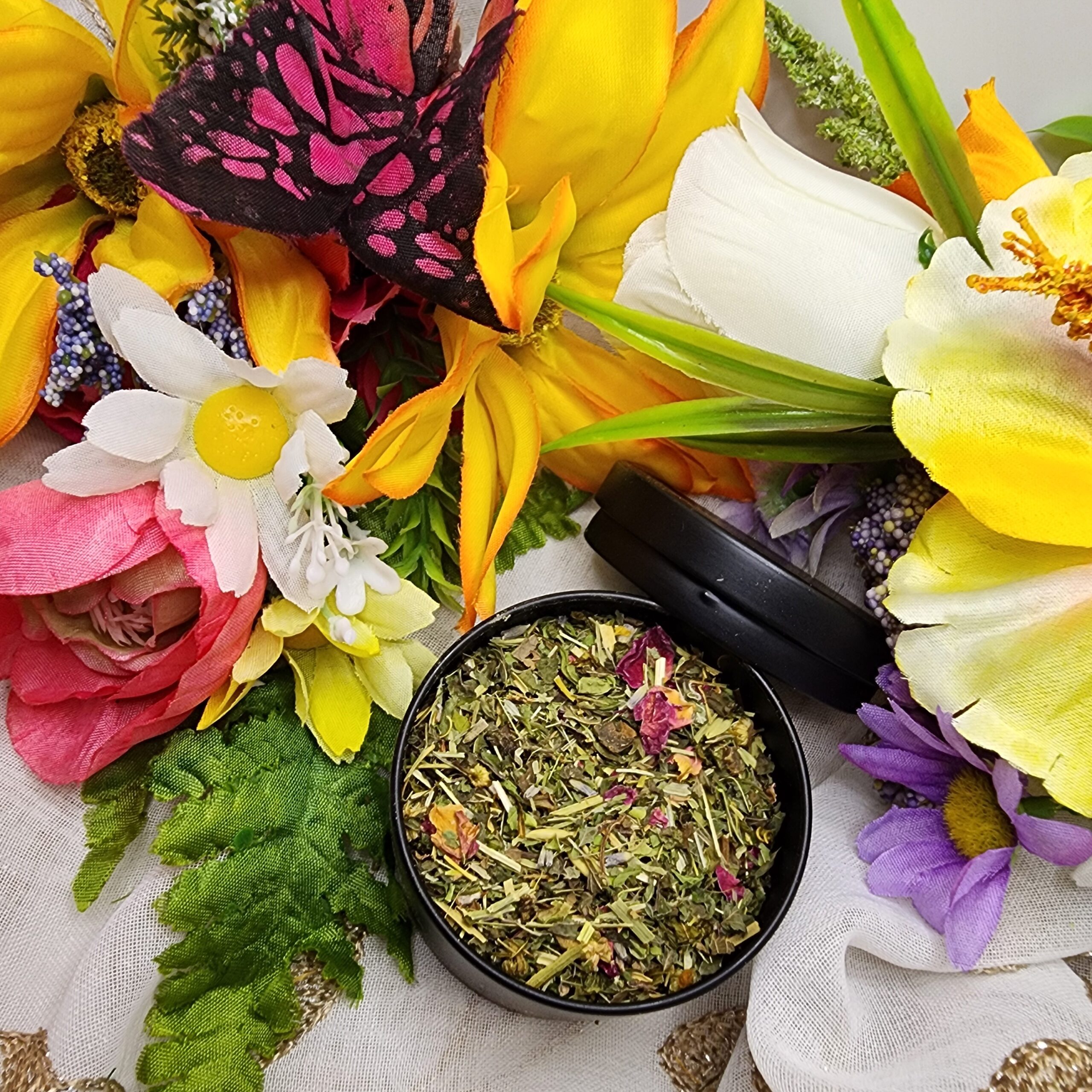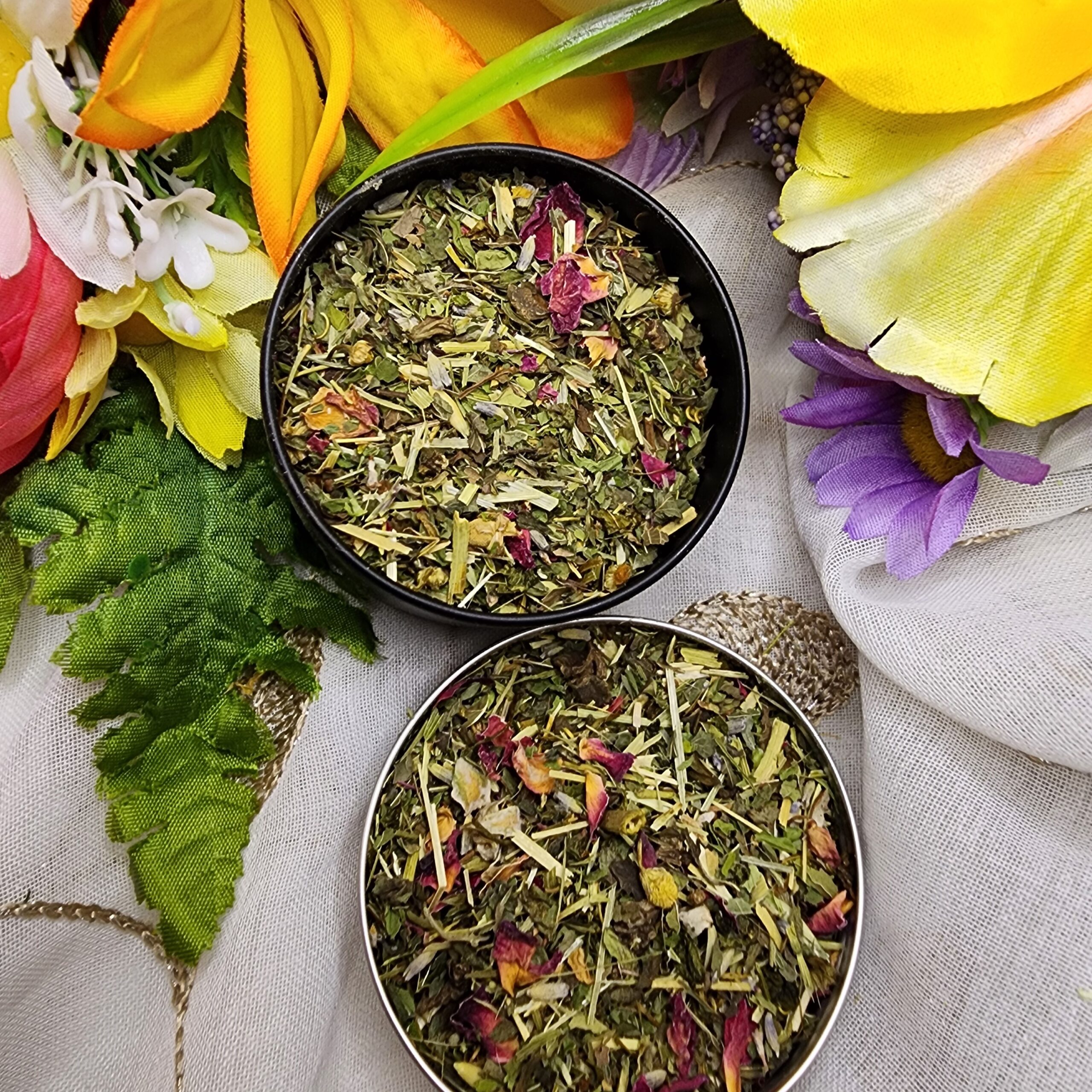 Ingredients: Lemon Balm, Passionflower, Skullcap, Chamomile, Spearmint, Valerian Root, Lavender, Rose Petals, and Oat Straw.