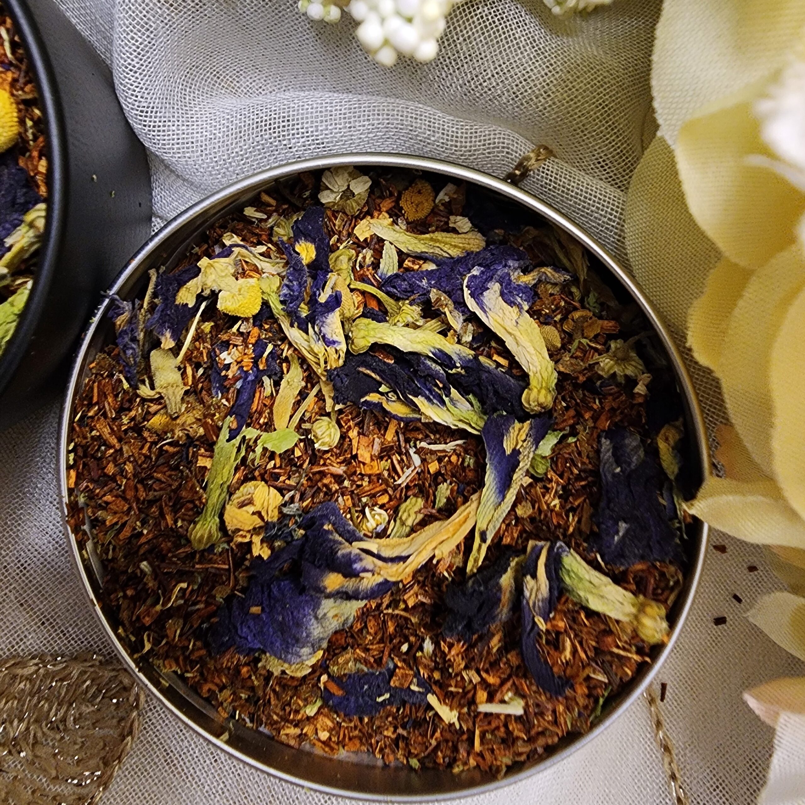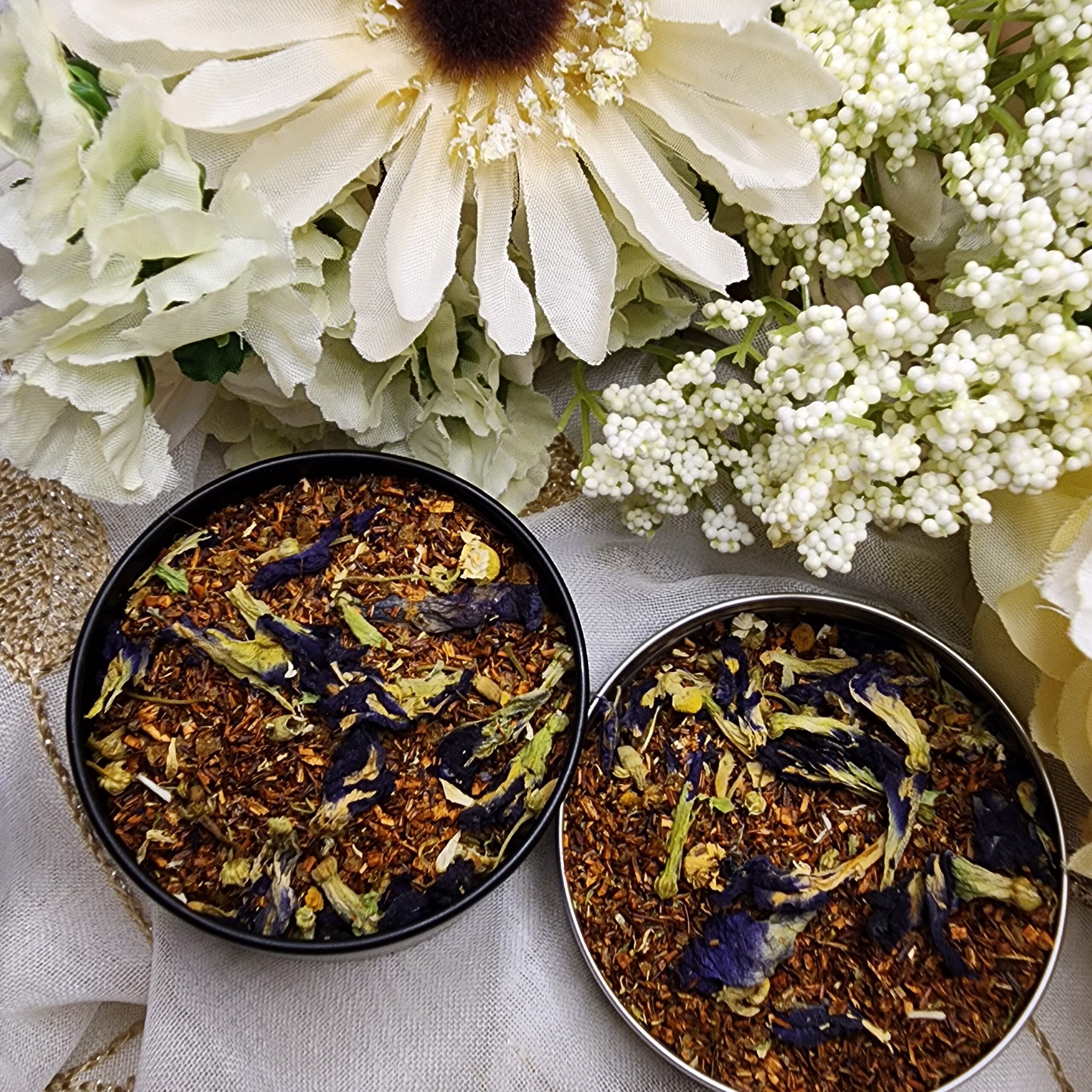 Ingredients: Rooibos tea, Honey flakes, Chamomile, Butterfly pea, Vanilla flavoring.
