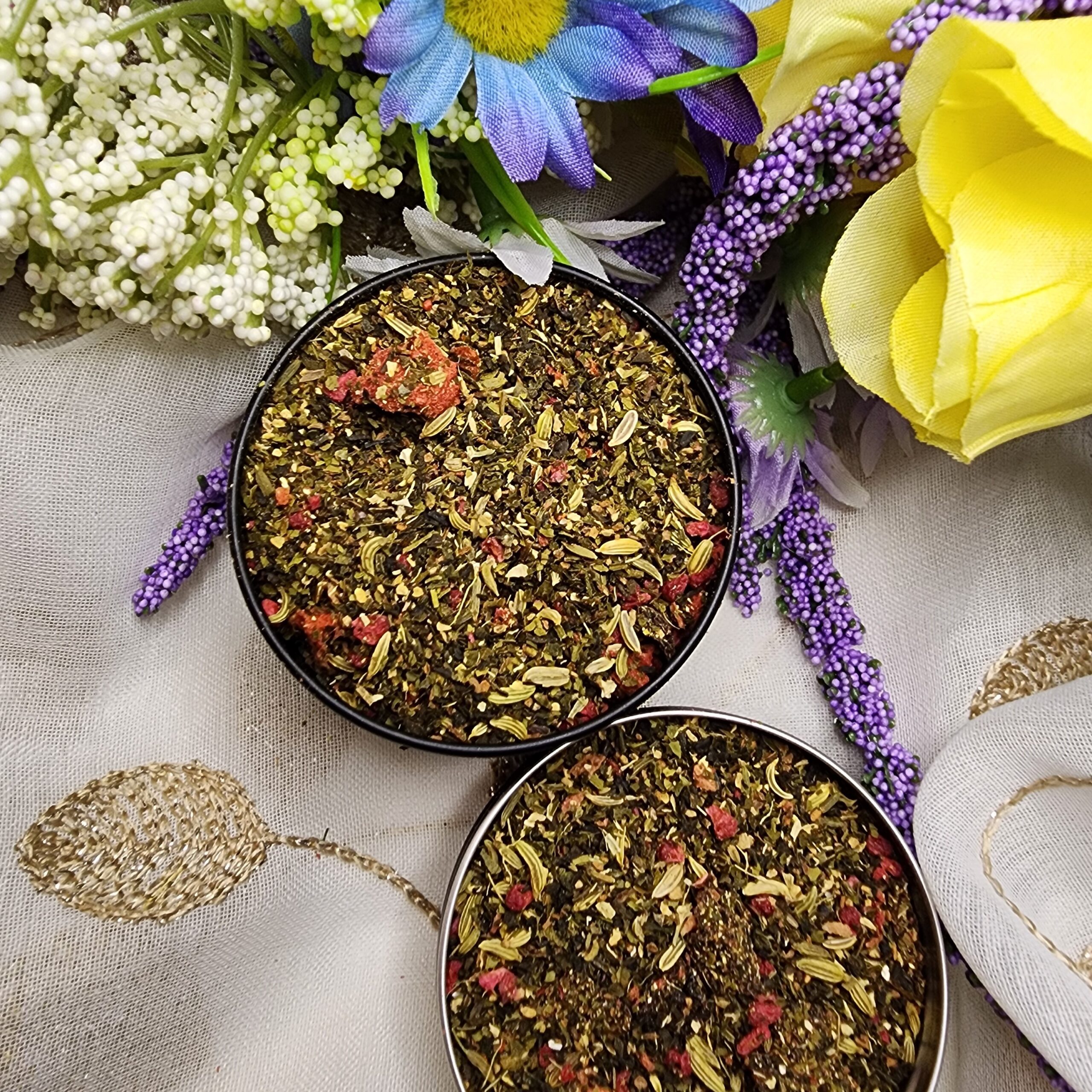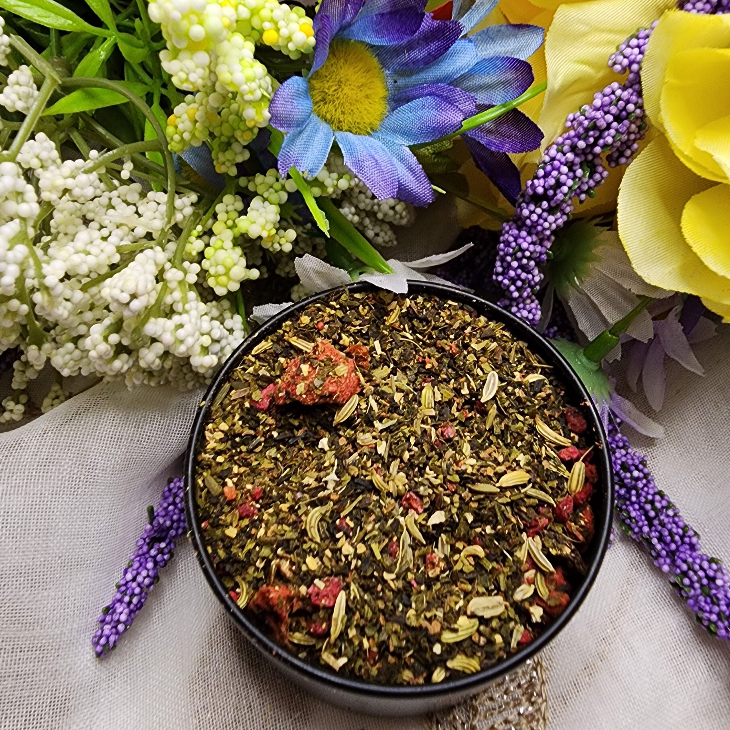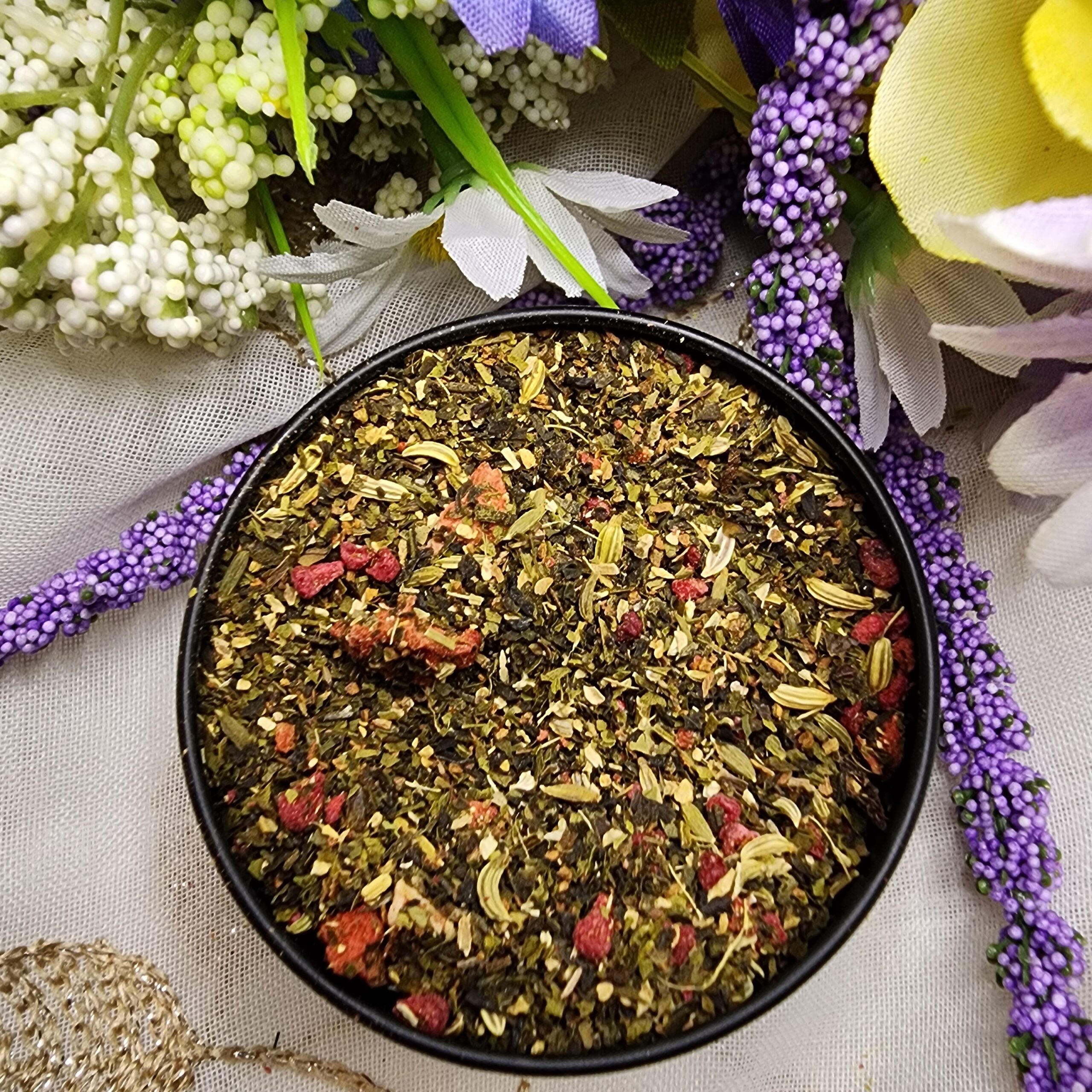 Ingredients: Green tea, freeze-dried strawberry pieces, freeze-dried raspberry pieces, dried cherry pieces, Shortbread crumbs, natural flavoring.